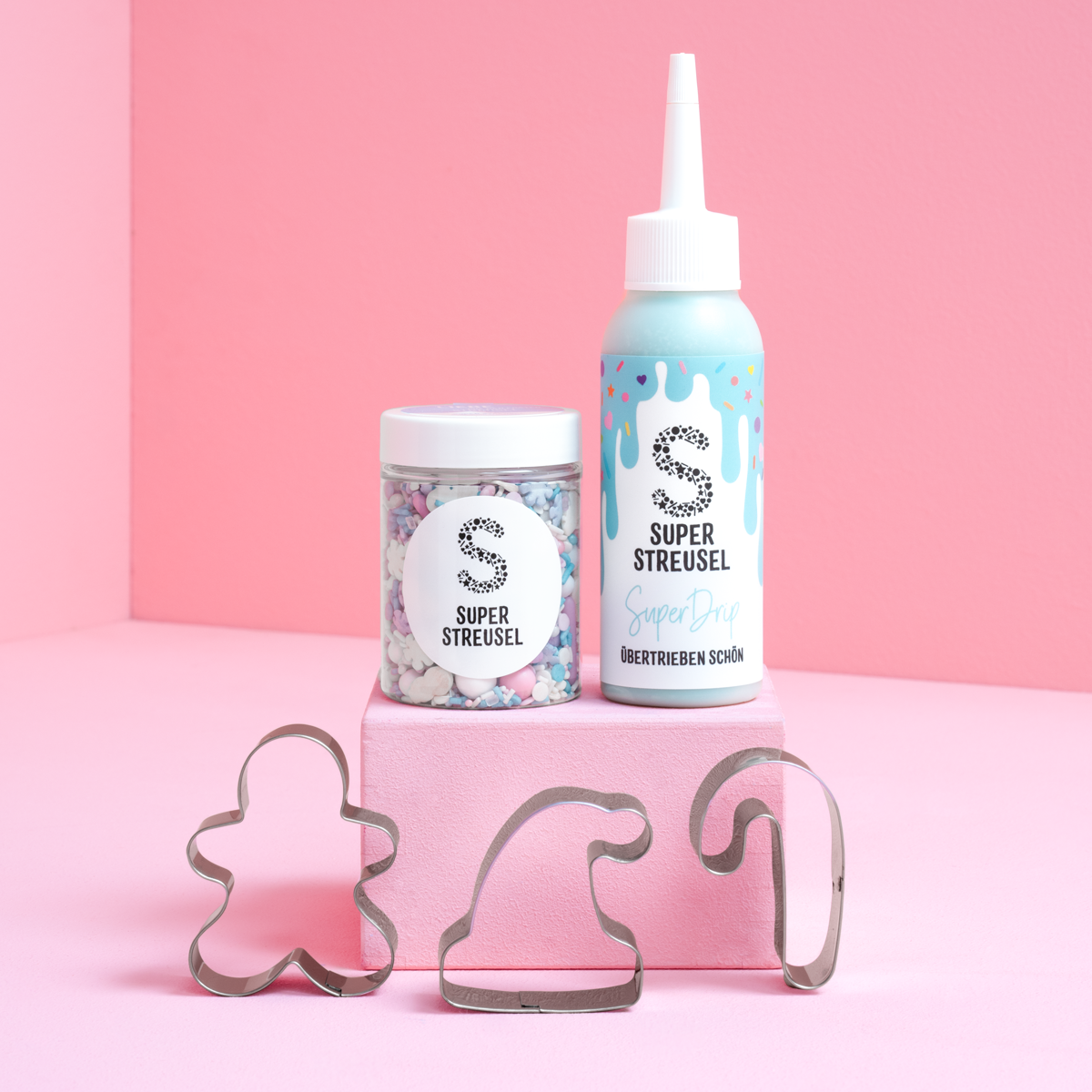 Om ervoor te zorgen dat de sprinkles goed aan je koekjes blijft plakken, breng je eerst SuperDrip aan op de koekjes. In de koekjesset zit de kleur IceBlue - die past perfect bij de StreuselMix SchneeStürmchen. SuperDrip is het perfecte glazuur dat je steeds opnieuw kunt opwarmen in de magnetron of in een bain-marie. Het droogt veel sneller dan chocolade en smaakt overheerlijk naar vanille. Na gebruik kun je je SuperDrip fles gewoon op kamertemperatuur in de kast bewaren. Meer informatie nodig? Je vindt ze hier: Info SuperDrip