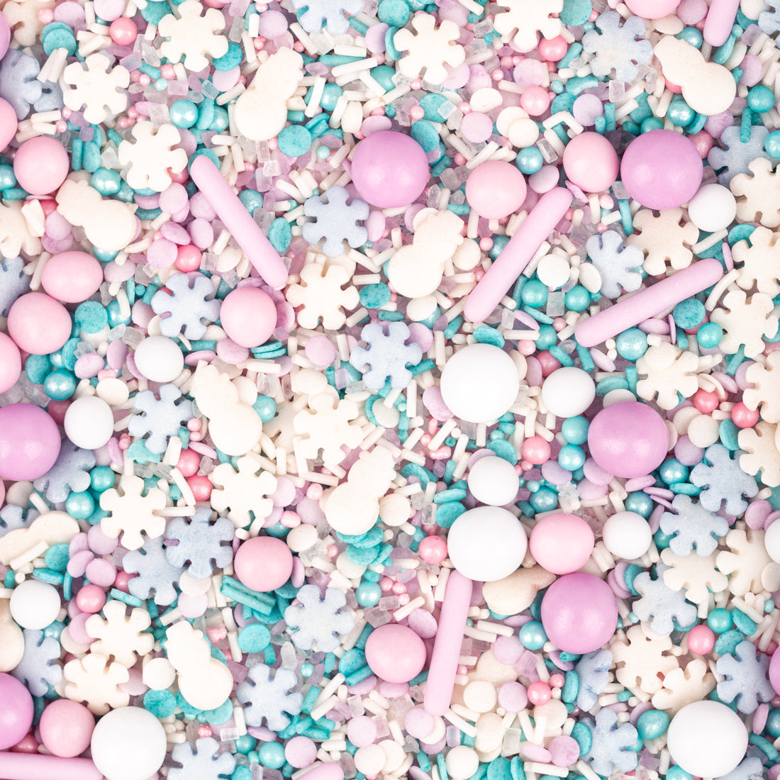 Sprinkles LetItSnow heeft alles wat je je maar kunt wensen voor je kerstkoekjes: Sprinkles in de vorm van sneeuwpoppen en sneeuwvlokken, fijne chocoladeballetjes, chique suikerstokjes en heel veel kleine confettis sprinkles, allemaal in de mooiste pastelkleuren: hemels blauw en turkoois, delicaat roze en lila en helder wit.