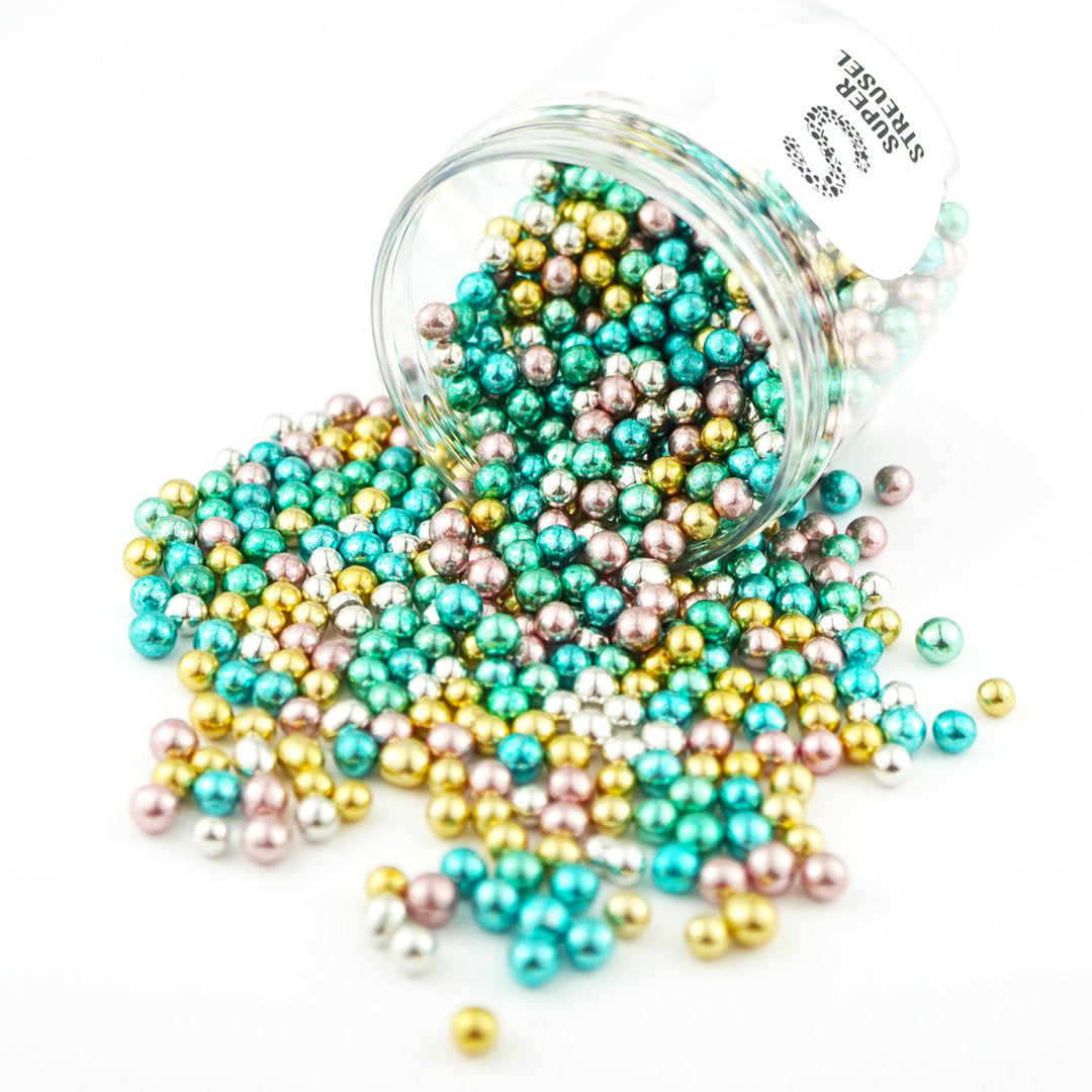 Eenheid prijs 6,60 € Per 100gYeah, onze Mini CrispyBalls zijn echt knapperig: metallic gekleurde parels in blauw, groen, roze, zilver en goud. Allemaal met een zachte, knapperige kern! Ze zijn klein maar hebben een grote impact, want of je nu wilt of niet: ze stralen je tegemoet en trekken je in hun knapperige ban. Eén keer geproefd, en je realiseert je: ze zijn echt superzacht! Je tanden blijven heel – ja, echt waar :) Perfect voor het snel oppimpen van cupcakes, taarten, ijs en alles wat een beetje kleurrijke, glanzende decoratie kan gebruiken.