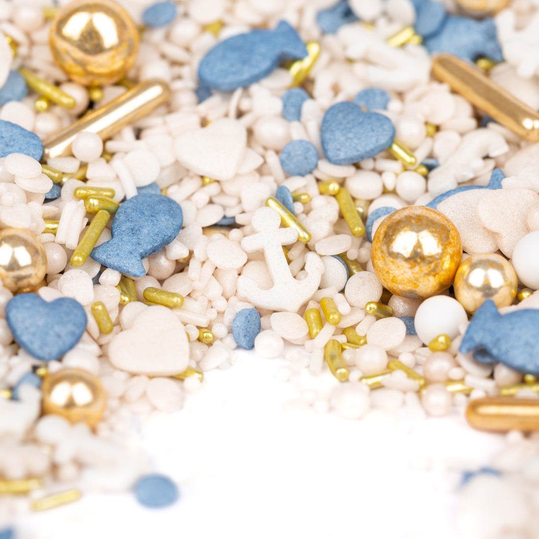 We gooien de trossen los en gaan op het open Kruimelzee. AcrossTheSea is zo mooi! We zien de gestrooide visjes al op een zee van room en botercrème, op zeetaarten en megataarten voor communie, vormsel of doop. Een echte allrounder voor op de koffietafel, onze AcrossTheSea. Het heeft alles wat je nodig hebt, zoals de Hamburgse zeeman zou zeggen: vissen, ankers en harten! Vergezeld van gouden suikerstokjes en chocoladeballetjes en confetti-hagelslag in zacht blauw en wit.