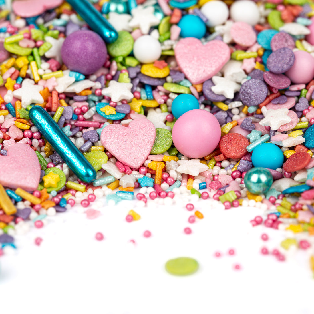 Dames en heren, hooggeëerd publiek! Wij presenteren u ... (TROMGEROFFEL) ... onze allereerste gemengde Super Streusel-Mix! Dit is de mix van verjaardagen van alle Hoera‘s die we hier doen. Kleur, kleur, kleur, dat is het motto. Suikerhagelslag in alle regenboogkleuren was het doel, we gingen er helemaal voor. Kleurrijker en vrolijker kan het niet. We hebben onze confetti-verslaving hier beleefd, daarom geeft deze stooigoedmix in Mijonen het kleine glitters, sterretjes, stippen en confetti. Wij houden er van. jij ook? De dikke, ronde, paarse en roze brummers in de mix zijn weer gevuld met knapperige heerlijke chocolade. Lekker zacht om mee te eten (geen keiharde suikerklontjes!). De middelgrote, metallic groene balletjes hebben een delicate krokante kern. Superlekker!!