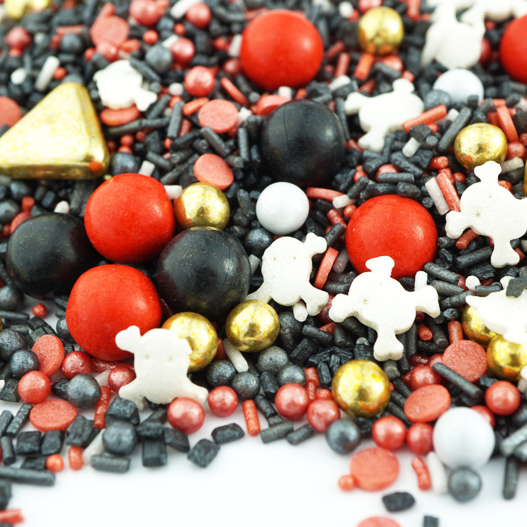 Ooglapjes af: Dit is de perfecte mix voor kleine piraten, schatzoekers en zeerover-in-spé! Deze kleurrijke SprinkleMix met witte schedelvormige sprinkles, rode, witte en zwarte suikerstrooisels, rood confetti, suikerpareltjes, grote zachte chocoladeballen in rood en zwart, stuurt je piratenfeest gegarandeerd naar een zee van strooiplezier. En omdat geen enkel piratenverjaardagstaart compleet is zonder een schat, hebben we de mix ook opgefleurd met gouden mini-chocoladeballen en gouden suikerdriehoekjes. Zo wordt het feest een succes voor alle matrozen. PiratenErewort!