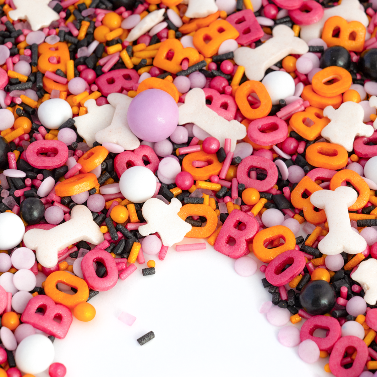 BOOOO! bevat alles wat je griezelhart sneller doet kloppen: brutale BOOOO-letters in oranje en roze, witte botten en spookachtige geesten, lila-kleurige chocolateballs, mini-knapperige balls in wit en zwart, een bonte mix van sprinkles en confettisprinkles in oranje, zwart, roze en lila.