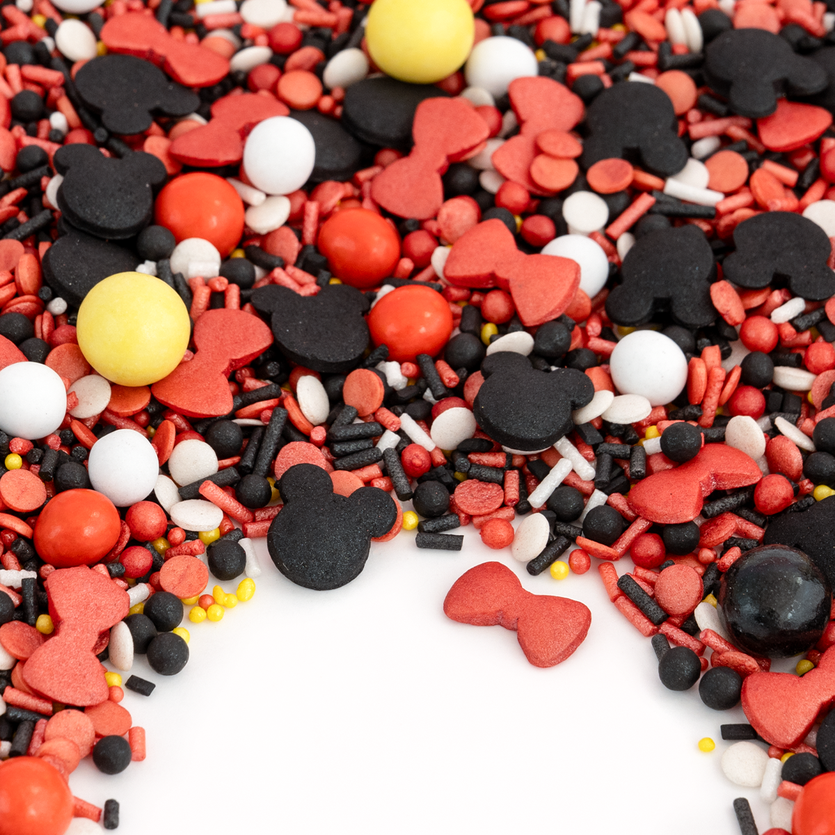 Wat erin zit: zwarte muizenkopjes met iconische oortjes, rode strikjesstrooisels voor de allerliefste look ooit, glanzende ChocoBalls in zwart en vrolijk geel, knapperige Mini CrispyBalls in wit en rood en natuurlijk een bonte mix van confettistrooisels in rood, wit en zwart.