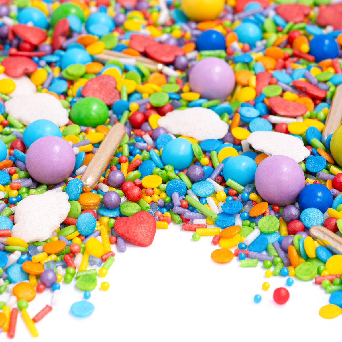 Zeg hallo tegen onze super strooimix volledig in regenboogkleuren! De kleuren paars, donkerblauw, lichtblauw, groen, geel, oranje en rood in de vorm van suikerhagelslag, confetti en parels. En als zonnestralen voegden we hagelslag en gouden suikersticks toe. Daarnaast rode hartjes als regenboog-proof of love en kleine groene, lichtblauwe en gouden bolletjes. Allemaal lekker zacht bedoeld om gegeten te worden (geen keiharde suikerklontjes!). Super lekker, super regenboog!