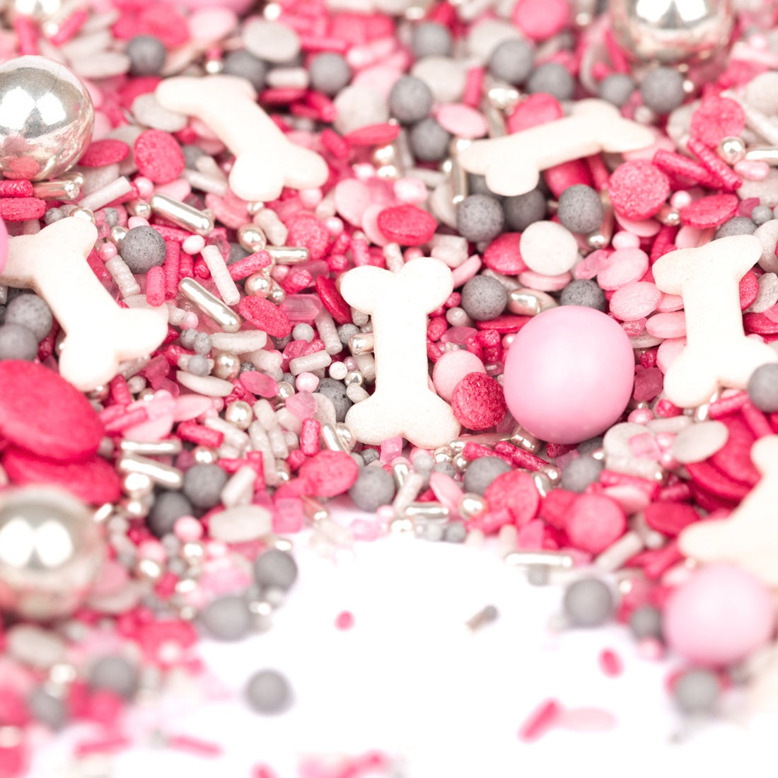 Wil je de top bereiken met je bakopdrachten? Een duidelijke zaak voor WoofyWoof! WoofyWoof versiert je taarten, cupcakes of cakejes voor het Paw Patrol verjaardagsfeestje onverschrokken vanuit de lucht. Perfect voor alle grote en kleine hondenfans die van roze houden en hun themafeest willen opdragen aan onze pluizige helden. Kleine botjes, roze en grijze confetti hagelslag, roze en zilveren nonpareils en chocolade balletjes zijn de klok rond te gebruiken voor verjaardagstaarten, themataarten of muffins in hondenstijl.