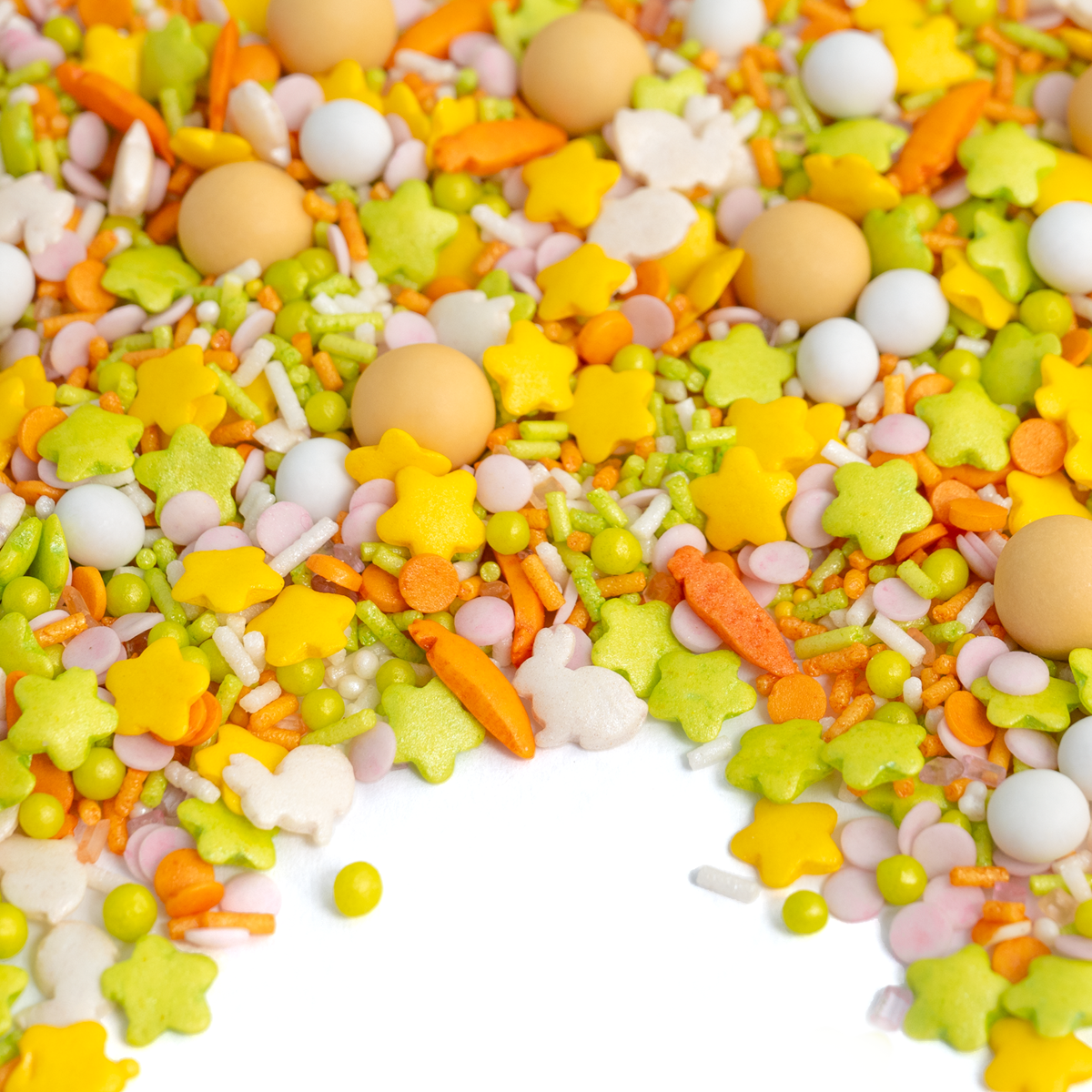 Lente-fris en absoluut suikersnoet – SprinkleMix CarrotKiss geeft je paastafel die WOW-factor! Hier zit alles in wat je paastafel nodig heeft om helemaal in een vrolijke, kleurrijke paasstemming te komen: Felgekleurde bloemetjesstrooisels in geel, roze, wit en groen, schattige konijntjesstrooisels in wit, oranje wortelstrooisels en heerlijke ChocolateBalls in oker, evenals kleine knapperige bolletjes in wit. De perfecte mix om worteltaart en paasbrood in een handomdraai om te toveren tot prachtige meesterwerkjes.