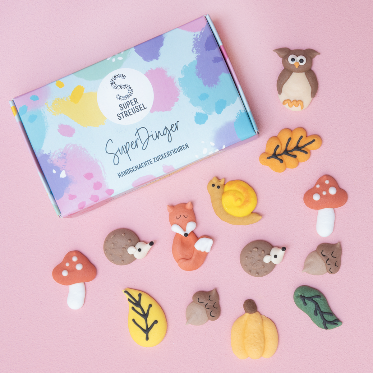 Elke SuperDing is zelf ontworpen, met de hand gegoten en met de hand beschilderd (ja, allemaal met de hand! Geen machine!). Met deze suikerfiguren versier je in een handomdraai prachtige herfsttaarten en cupcakes. Kinderen zullen dol zijn op de schattige boswezens, eikels, paddenstoelen en kleurrijke herfstbladeren.