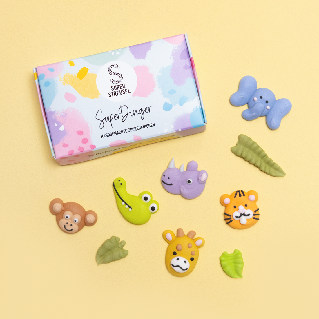 Hier zijn ze, je nieuwe glazuur voor taarten, cupcakes & co. Onze SuperDingers zijn handgemaakte suikerfiguren, de perfecte decoratieve stukken die je superleuk kunt versieren op taarten, botercrème stippen of cupcake kronen. SuperStreuselSchwör: Nul moeite, maximaal effect! Elke SuperDing is ontworpen, gespoten en geschilderd met de hand (ja, allemaal met de hand! Geen machine!).