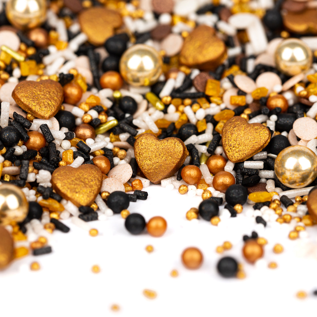 De grote verleider onder onze liefdesmixen. Je moet voor hem oppassen. Hij is moeilijk te weerstaan. Een twinkeling hier, een knipoog daar, een ondeugende glimlach en een hart van goud. In een mum van tijd betovert Casanova je en kun je niet meer ontsnappen. Casanova voelt zich bijzonder op zijn gemak met chocolade - het flatteert zijn teint. Gouden chocolade balletjes en hartjes, confetti hagelslag in zachte room en bruin. Plus bronzen en zwarte kraal sprinkles samen met zoete kristallen sprinkles. Nou, als dat niet rechtstreeks naar het chocolade hart gaat.