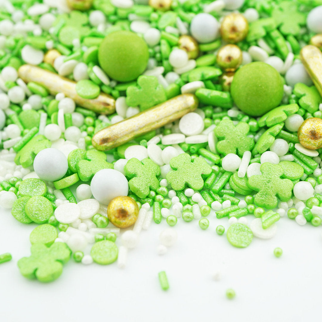 Yeaaaaaaahhhh, hier komt het, geluk in blikjes! Shamrock-hagelslag met vier blaadjes en nog meer geluk door een mega-extract van glanzend goud: gloednieuwe gouden mini-chocoladebolletjes en gouden suikersticks!
