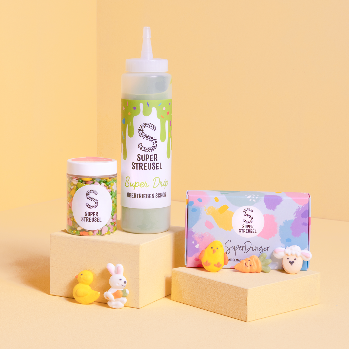 PaasPompöster MagicSet! Met deze paasset zal geen enkele paasbakkerij zonder de allerbeste paas-supermood zitten. Meer Pasen dan dit kun je echt niet krijgen: SuperDrip Lime voor de paasweide op je koekjes, SpringBreeze met alles wat op de paasweide rondhangt: Konijntjes, vlinders, paaseieren, bloemen en wortels. Plus SuperDringer Hasi's bende met de schattigste schaapjes, konijntjes en kuikentjes. Serieus, met de paasset ben je zo voorbereid op Pasen. De paashaas kan morgen binnen wippen en de familie kan voor je deur staan - geen probleem! Pasen is waar de paasset is.