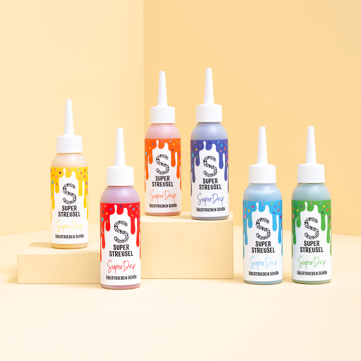Verwarm je SuperDrip RainbowSet snel in de magnetron of in een bain-marie. Gebruik het dan direct op muffins, koekjes, cakes en ijs. Of maak je eigen taarttoppers - het is supermakkelijk! SuperDrip droogt veel sneller dan chocolade en is daarom de perfecte basis voor je sprinkles.