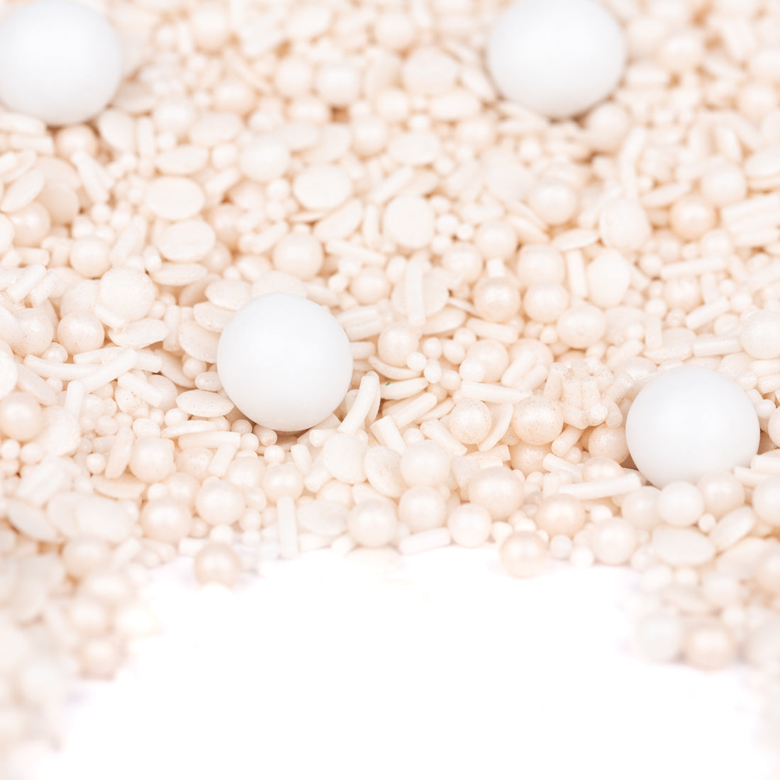 Eenheid prijs 8,78 € Per 100gNiemand kan er zo wit en onschuldig uitzien als deze monochrome sprinkle mix. Een stortvloed van witte hagelslag, witte suikerparels en witte confetti rolt straks over je druiptaart, cupcake of koekje, waarbij één ding in het bijzonder opvalt: de grote witte chocoladeparels die, als niemand kijkt, snel in je mond moeten verdwijnen - gewoon als kwaliteitsgarantie natuurlijk.