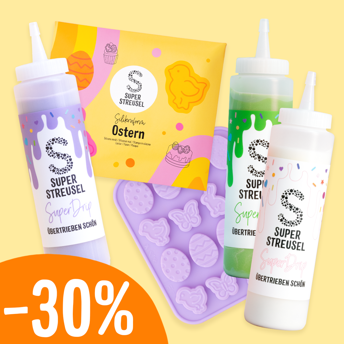 Als dit geen echte highlight is! Drie van onze absolute SuperDrip-favorieten plus de Siliconen mal Pasen – perfect voor taarten en muffins in een vrolijke Paaslook. En dat alles met 30% korting*. Daar wil je oven spontaan van voorverwarmen!