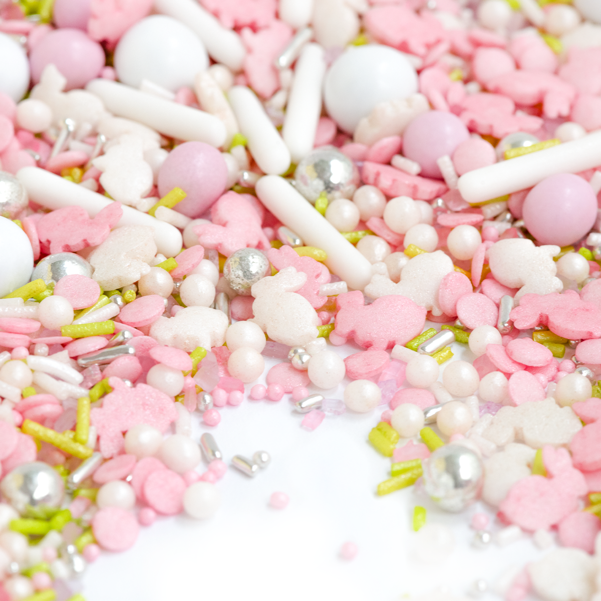 Voor iedereen die Pasen wil vieren met een snufje elegantie en een vleugje schattigheid, hebben we onze zoete "BunnyBliss" hagelslagmix samengesteld. Het is tot de rand gevuld met heerlijk mooie haasjeshagel in roze en wit, roze confetti-hagel en limoengroene hagelslag. "BunnyBliss" staat altijd voor je klaar als je paaskoekjes wilt pimpen, speelse muffins wilt maken of elegante paastaarten wilt serveren. Tot slot, zin in een catchy deuntje? Het maakt bakken nog luchtiger! Dus... je herinnert je Stups de kleine paashaas toch nog wel?