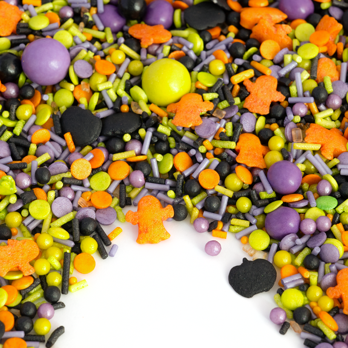 CreepyDarkness heeft alles wat je griezelhart begeert: oranje spoken en zwarte pompoenen, paarse en groene chocolateballs, kleine paarse mini-knapperige balls en brutale confettisprinkles in paars, groen en zwart – alles met de hand gemengd voor de perfecte griezelglans. Of het nu gaat om een Halloween-taart, cupcakes of een monster-themafeestje – met CreepyDarkness wordt elke hap een klein schokmoment vol sprinklesplezier!