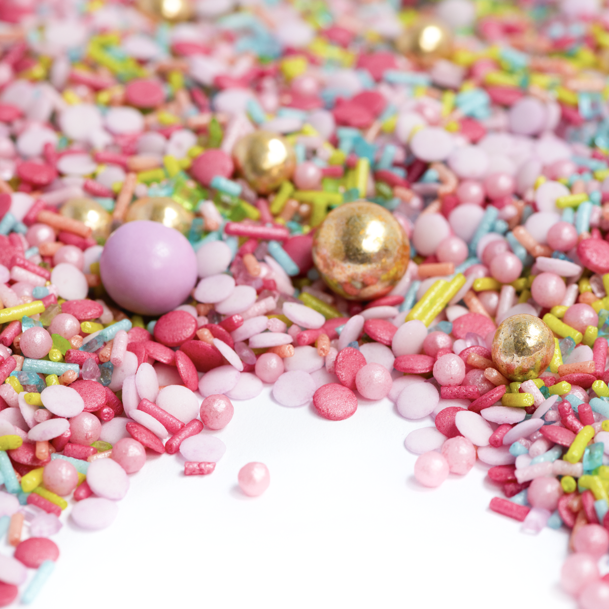 HappyBirthday is mooier en vooral kleurrijker dan welk boeket bloemen ook: lichtblauw als de lucht, groen als een weiland en natuurlijk een lading roze en roze! Allemaal in de vorm van confetti hagelslag, nonpareils en gouden chocoladebolletjes en mini crispy balletjes.