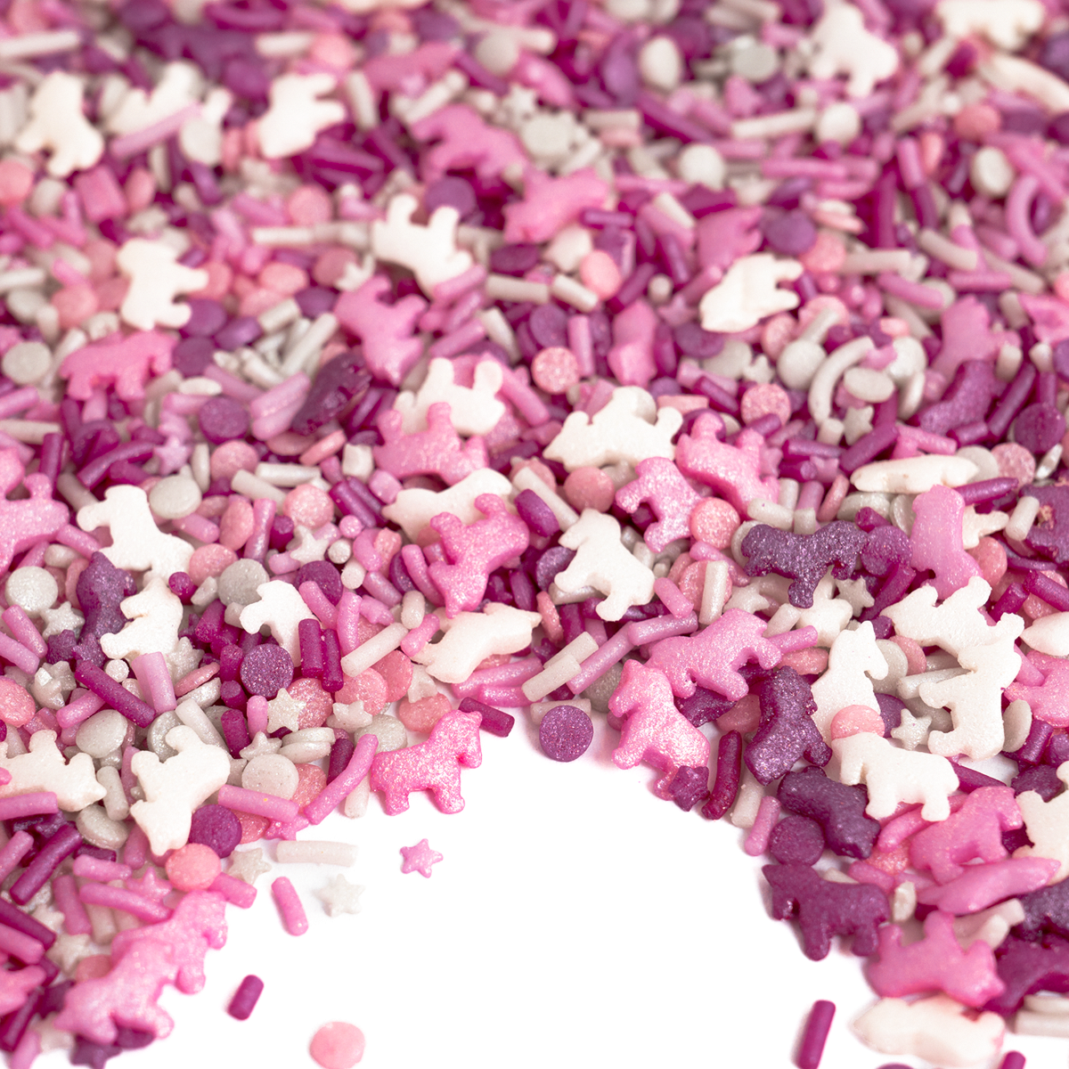 Kleine én grote eenhoornfans zullen stralen van vreugde wanneer ze deze roze, witte en lila eenhoornsprinkles ontdekken, gecombineerd met glinsterende sterretjes en confettisprinkles. Perfect voor een kinderverjaardag, een themafeest of gewoon een magische dag! 🦄✨
